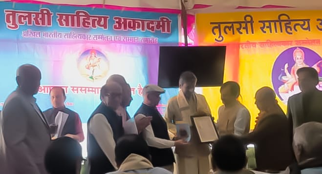 पटना । तुलसी साहित्य अकादमी द्वारा 25वें अखिल भारतीय साहित्यकार सम्मेलन एवं सम्मान समारोह में पटना, बिहार के डॉ. वीरेंद्र कुमार भारद्वाज को तुलसी साहित्य-सम्मान— 2025 से नवाजा गया। डॉ. खेमसिंह डहेरिया, सभापति निजी विश्वविद्यालय विनियामक आयोग, भोपाल, डॉ. नरेश कुमार तिवारी, शिक्षाविद् डॉ. प्रभा मिश्रा, डॉ. राजेश श्रीवास्तव, निदेशक, रामायण केंद्र, श्री पवन कुमार जैन, आई.टी. एस. अधिकारी भारत सरकार, दूरसंचार विभाग आदि के हाथों प्रदान किया गया।